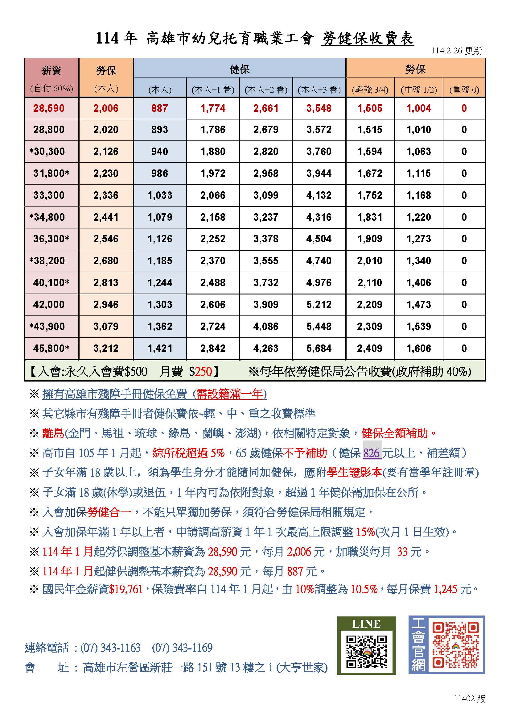 114年幼兒托育職業工會勞健保收費表